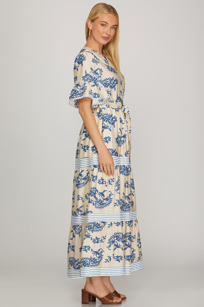 SHORT RUFFLED SLEEVE WOVEN PRINT TIERED MAXI DRESS WITH CONTRAST DETAIL AND POCKETS