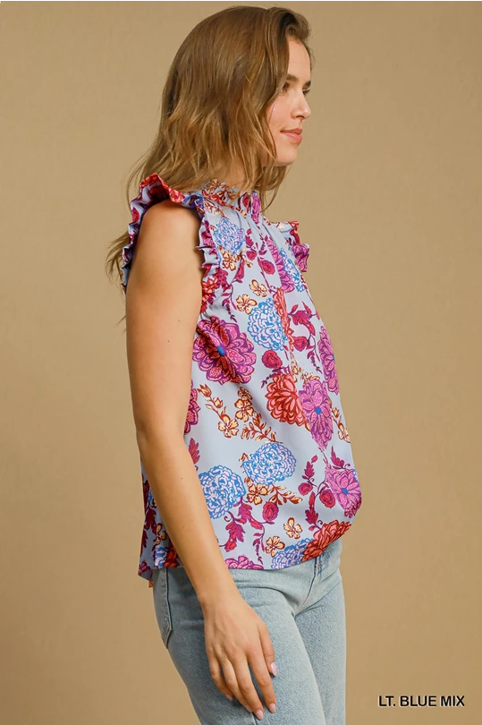 UMGEE Floral Print Ruffle Neck Top