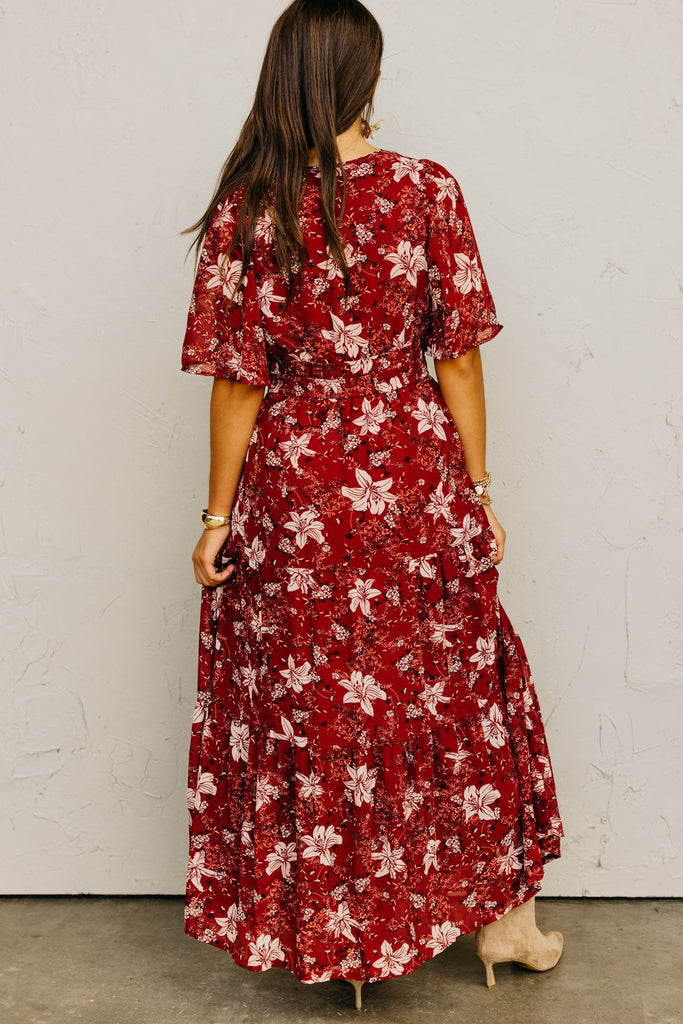 A brown background with a floral print throughout in hues of ivory, tan, charcoal, and brown