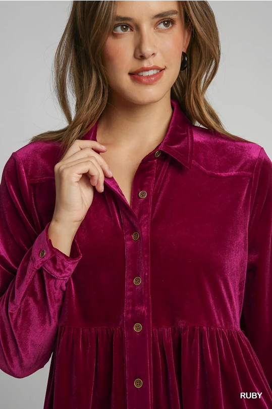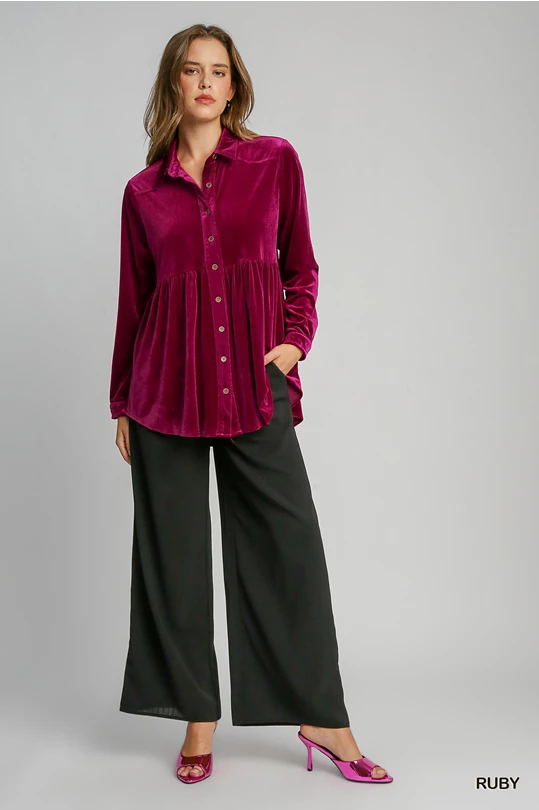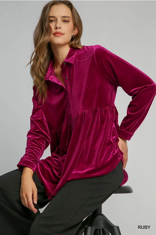 UMGEE Velvet Button Down Collared Top Ruby