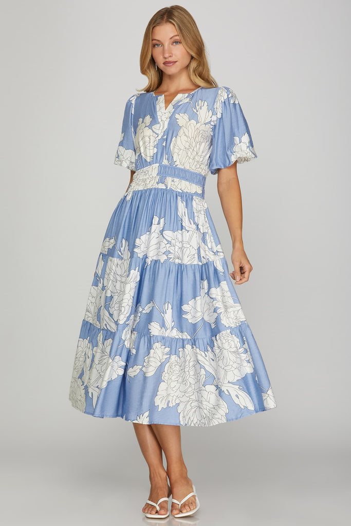 SHORT BUBBLE SLEEVE V NECK TIERED PRINTED MIDI DRESS WITH POCKETS